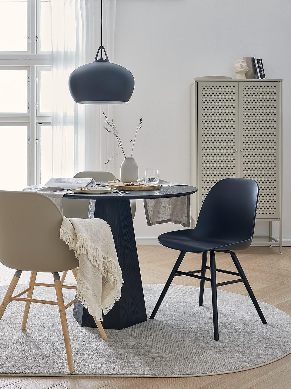 Voľné plochy na podlahe a na stenách otvárajú ideálny priestor pre zariadenia jedálne v severskom štýle. Či už ide o tzv. „tulipánový stôl“ v štýle fínskeho architekta Eera Saarinena alebo obdĺžnikový stôl v dvojfarebnej kombinácii – nápadné škandinávske kusy nábytku štruktúrujú priestor svojou pragmatickou siluetou. Pokiaľ ide o materiál, rozmanitosť je samozrejmosťou: masívne drevo, čalúnenie, kovové rámy alebo extravagantne tvarované doplnky tvoria moderný mix.