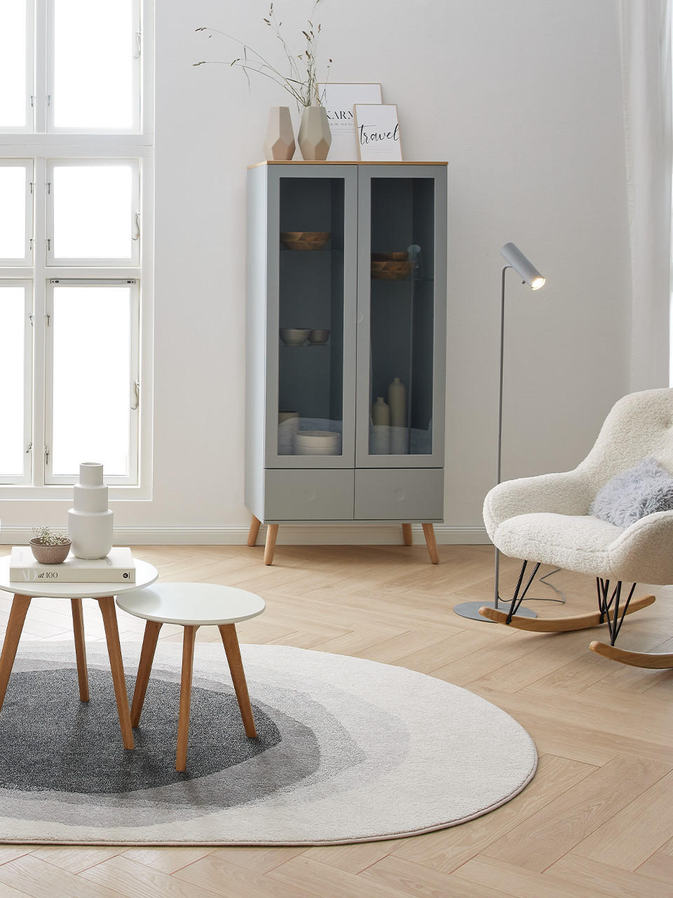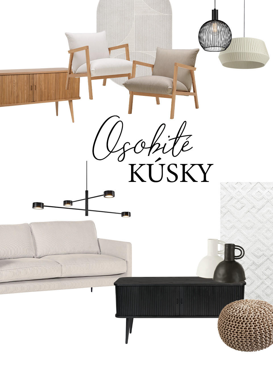koberec v prírodných farbách. Čierne, biele a sivé doplnky, ako je filigránový odkladací stolík alebo tmavo orámované obrazy dodajú miestnosti štruktúru a poriadok.