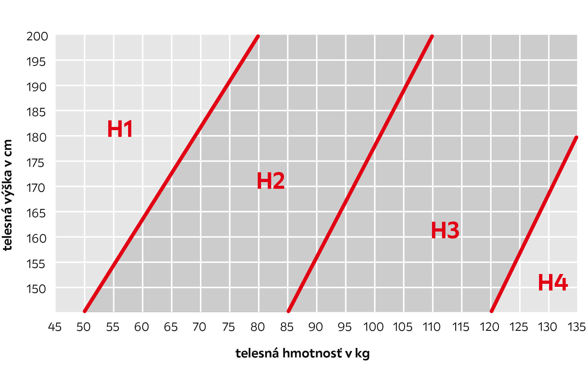 Telesná výška v grafe udáva, aká hmotnosť pripadá na aký matrac. Telesná hmotnosť & výška slúži ako orientačná pomôcka pre ideálny stupeň matraca. Dbať sa ale musí aj na individuálny pocit pri ležaní a pociťovaní bolesti: ak máte vyššiu váhu a na pevnejšom matraci sa vám zle spí, zvoľte nižší stupeň tvrdosti. Výber ovplyvňuje aj pozícia pri spánku. Pri kúpe matraca si matrac vždy vyskúšajte a otestujte rôzne stupne tvrdosti. Len tak sa vám podarí nájsť ten správny matrac.
