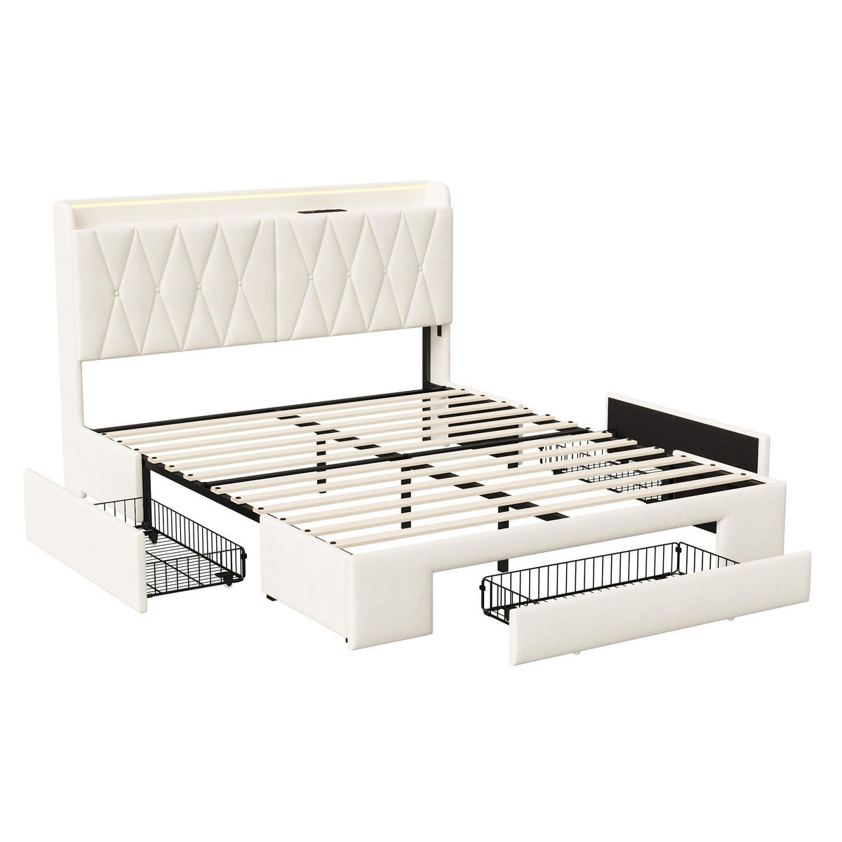 ČALÚNENÁ posteľ 140x200 cm, béžová, s USB a LED, manželská posteľ s 3 zásuvkami, posteľ z masívneho dreva, zamat