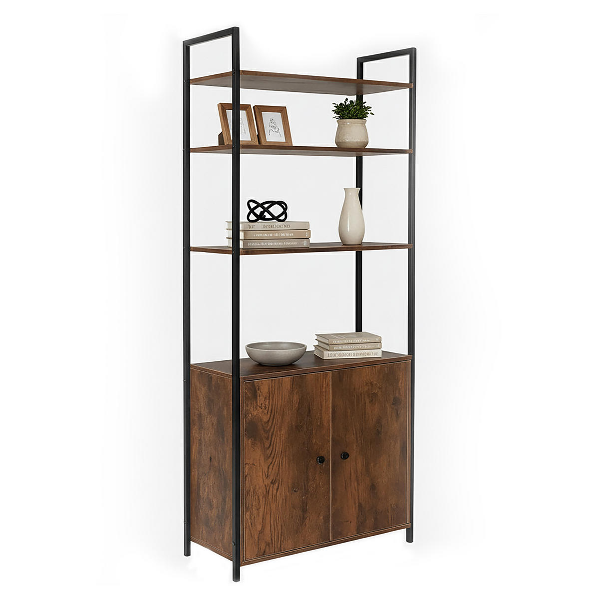 Knižnica ponúka na 4 otvorených úrovniach veľa priestoru na vystavenie kníh, dekoratívnych predmetov a rastlín. Do praktickej spodnej skrinky je možné uložiť úložné boxy, zložky a ďalšie veci. Výška 2 priehradiek je flexibilne nastaviteľná vďaka vkladacej polici, takže je možné uložiť predmety rôznej výšky. Štýlový dizajn robí z tejto stojacej knižnice dekoratívny prvok v každej miestnosti, v ktorej vyniknú tvoje knihy.